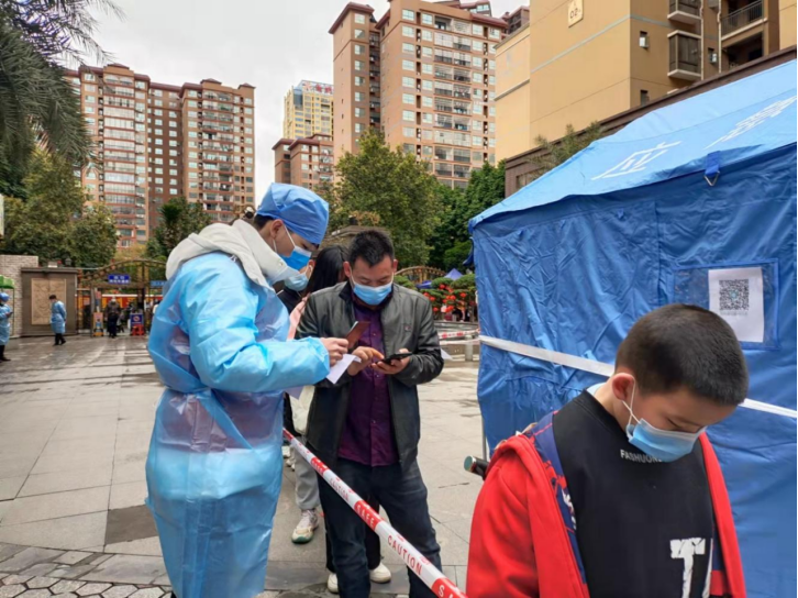 图为2019级管本1班韦冰在社区大型核酸采集现场疏导群众