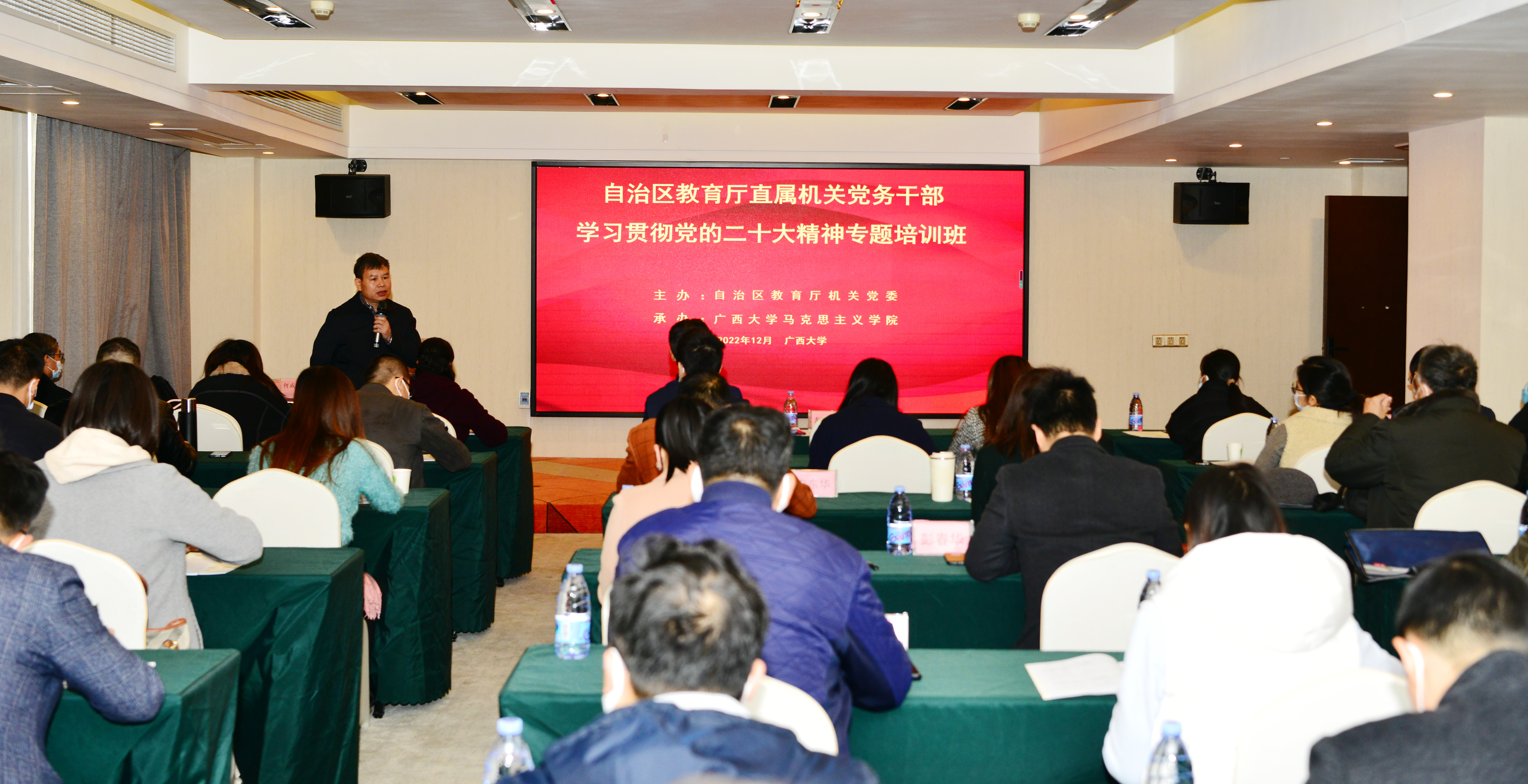 培训班紧扣学习党的二十大精神,结合党务干部特点,邀请自治区人民政府参事、自治区党校教授、广西大学教授、区直机关工委相关领导为大家授课,精心安排《从五个维度深刻把握党的二十大精神的内涵要求》《学习贯彻习近平总书记在党的二十大广西代表团的讲话精神—谱写中国式现代化广西篇章》《新时代意识形态工作》《<习近平谈治国理政(第四卷)>导读》《如何做好新时代机关党建工作》等课程,通过课堂授课、现场教学、行动学习等形式相结合,帮助学员深刻领会、准确把握党的二十大精神的重大意义、丰富内涵、核心要义和实践要求,切实把思想和行动统一到党的二十大精神上来,把学习成果转化为推动新时代教育事业高质量发展的实际成效。