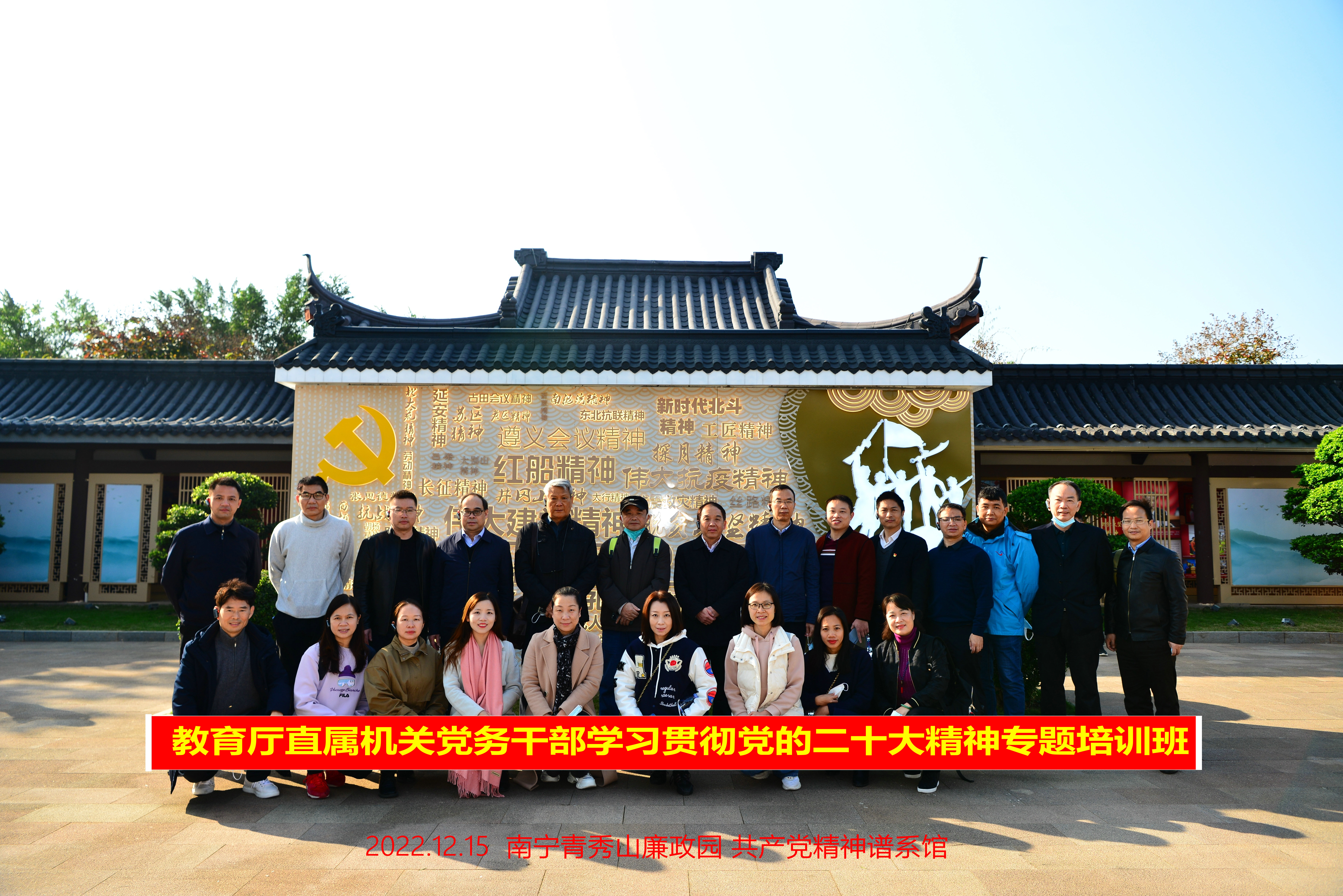 12月12日至15日,自治区教育厅举办“直属机关党务干部学习贯彻党的二十大精神专题培训班”。本次培训班主要是针对直属机关党支部书记、支委等党务干部开设的,共有50余名学员参加培训,其主要目的是深入学习好贯彻好党的二十大精神,通过专题培训引导直属机关党务干部深刻领会、准确把握党的二十大精神的丰富内涵,提升思想政治素质和理论水平,坚持不懈用习近平新时代中国特色社会主义思想凝心铸魂,把力量干劲凝聚到实现党的二十大确定的各项任务上来,为推进广西教育高质量发展贡献机关党建力量。