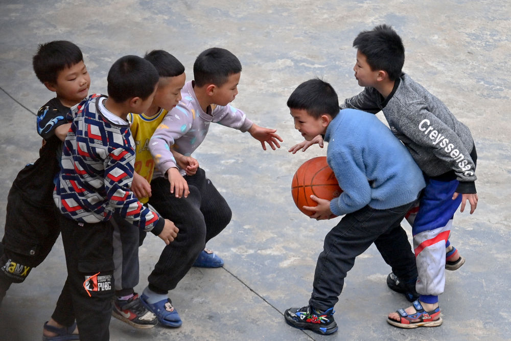 2023年4月7日,小学生在桂黔乌英苗寨球场打篮球