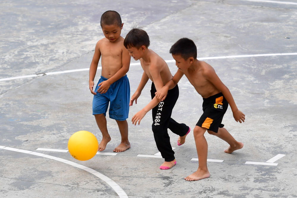 2020年8月13日,小学生在桂黔乌英苗寨球场玩皮球