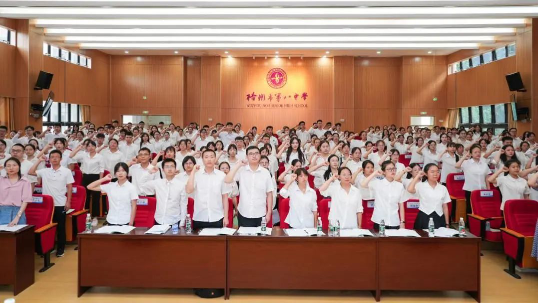 梧州市教育局直管学校241名新入职教师线下集中培训在梧州市第八中学顺利举办,培训了教育理论、教学方法、班级管理等方面的知识和技能。图为新教师宣誓仪式。