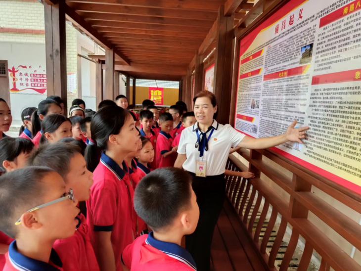 钦州市浦北县江城街道青春小学利用红色长廊、红湾阅读区讲红色历史故事。