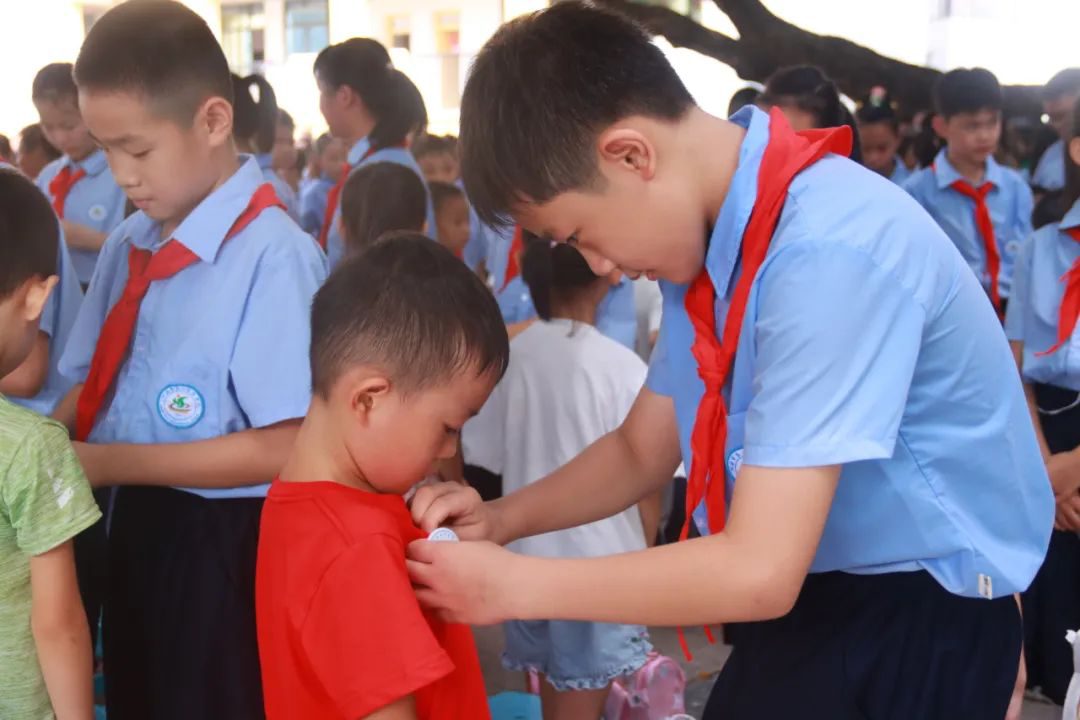 北海市第二实验学校举行了一年级新生入学欢迎仪式,高年级学长为新生佩戴校徽,逐梦扬帆,梦想起航。