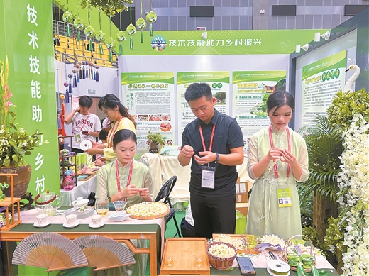 9月15日,2023中国—东盟职业教育联展暨论坛技术技能展上,横州职业技术学校的师生正在制作茉莉花香包。 本报记者 刘 琴/摄
