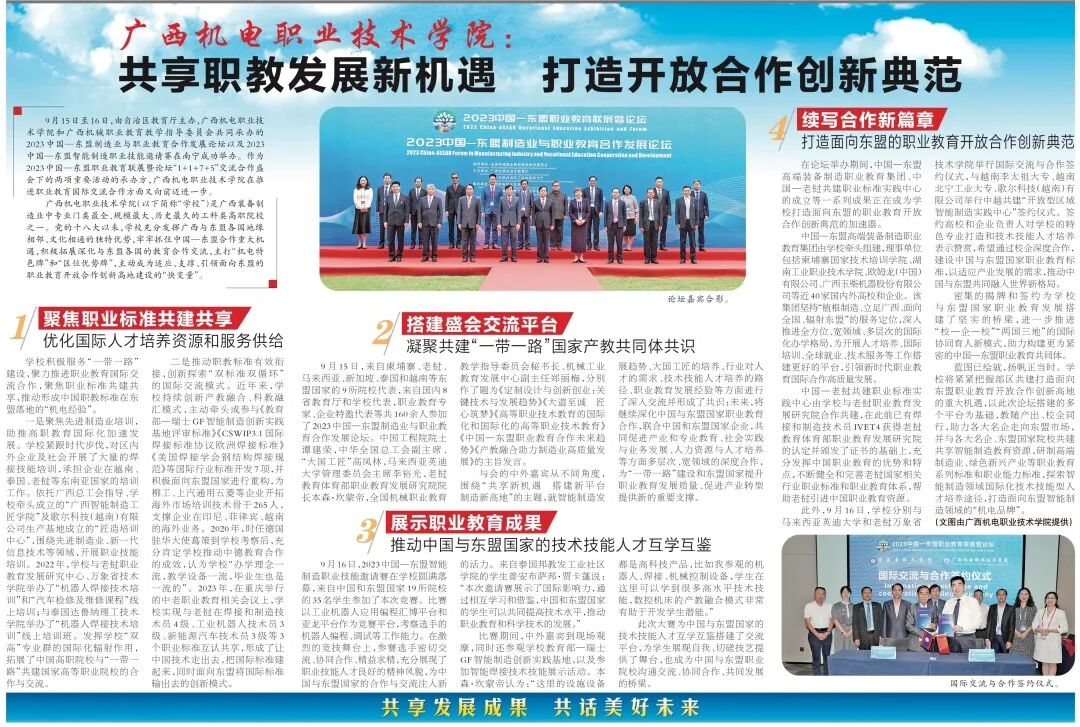 广西机电职业技术学院(以下简称“学校”)是广西装备制造业中专业门类最全、规模最大、历史最久的工科类高职院校之一。党的十八大以来,学校充分发挥广西与东盟各国地缘相邻、文化相通的独特优势,牢牢抓住中国—东盟合作重大机遇,积极拓展深化与东盟各国的教育合作交流,主打“机电特色牌”和“区位优势牌”,主动成为适应、支撑、引领面向东盟的职业教育开放合作创新高地建设的“快变量”。