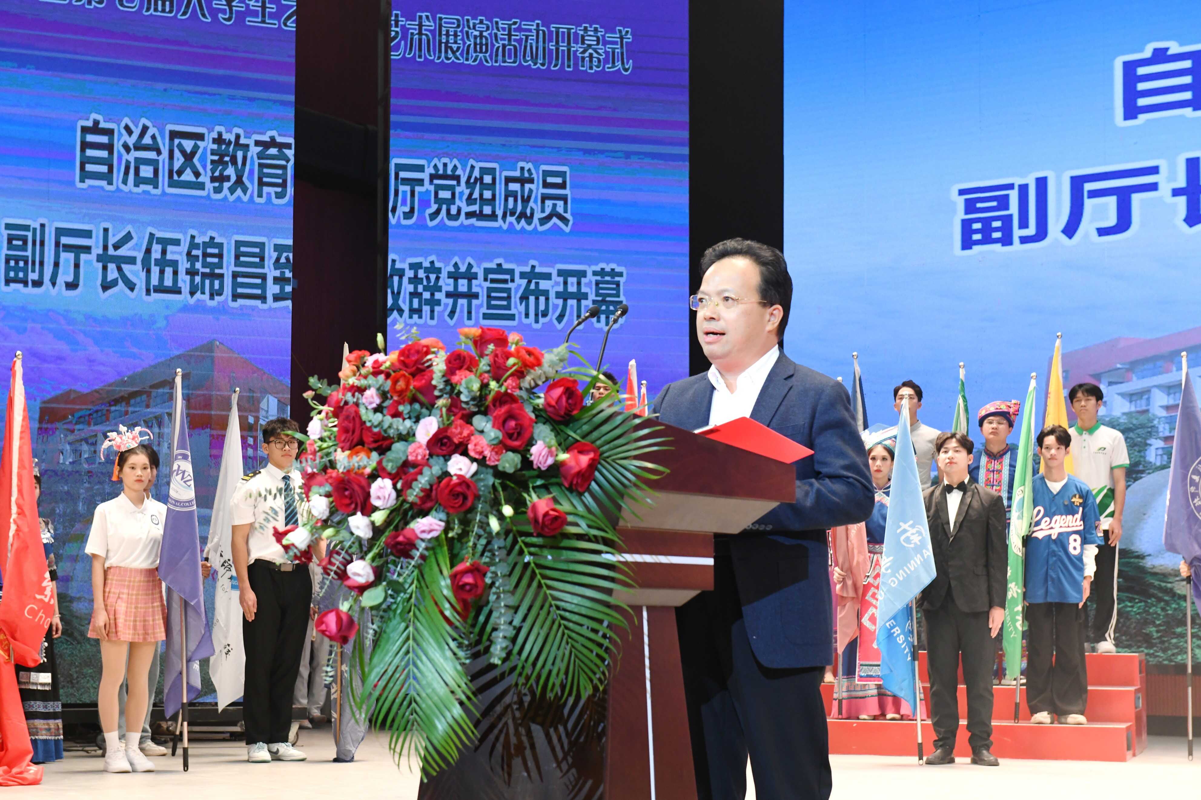 2023年11月20日,广西第七届大学生艺术展演活动开幕式在桂林师范高等专科学校音乐厅隆重举行,自治区教育厅党组成员、副厅长伍锦昌出席开幕式并宣布开幕。参加展演活动开幕式的还有来自全区55所高校的校领导及师生代表。