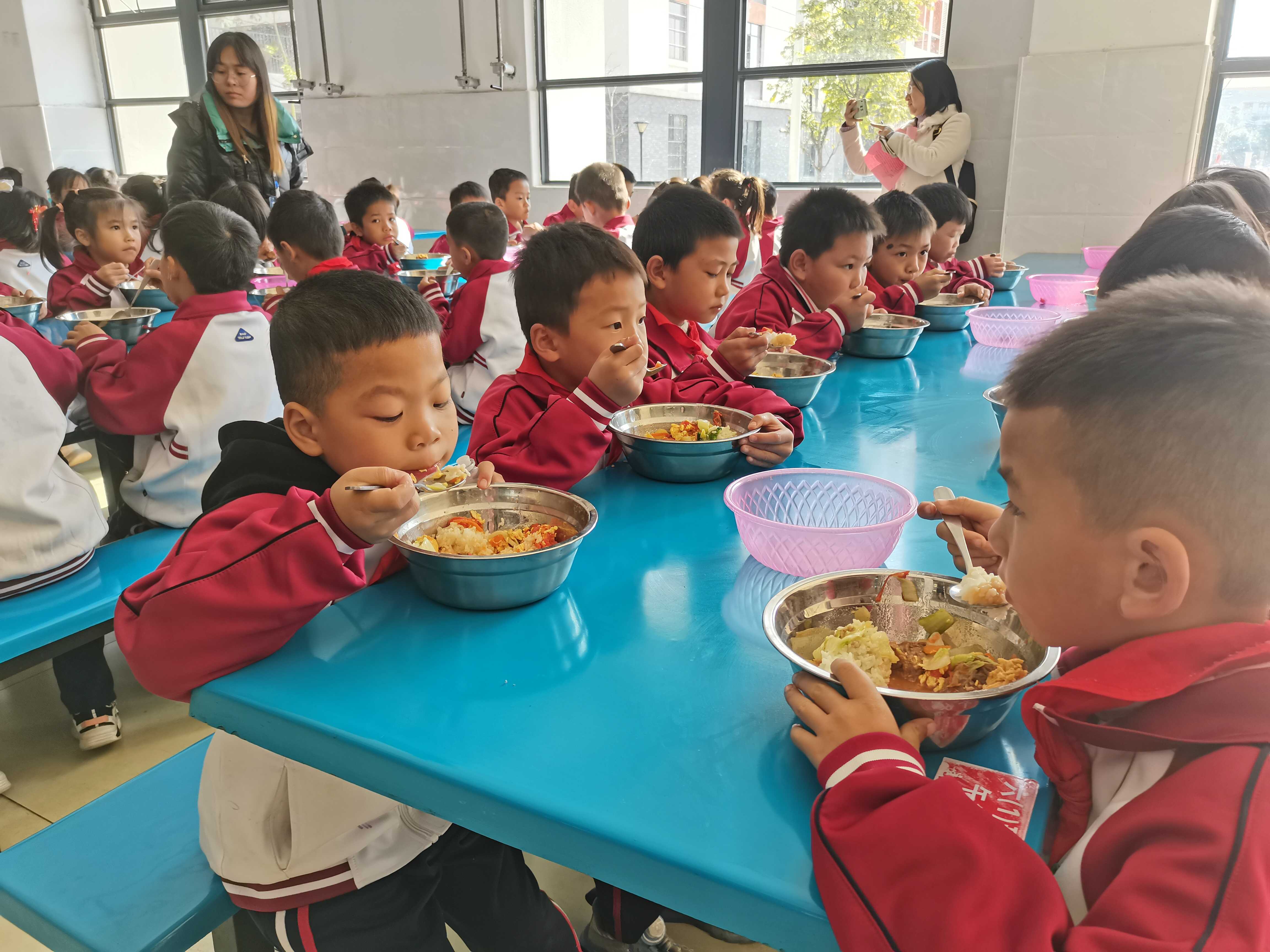隆安宝塔实验小学的学生正在食堂有序就餐
