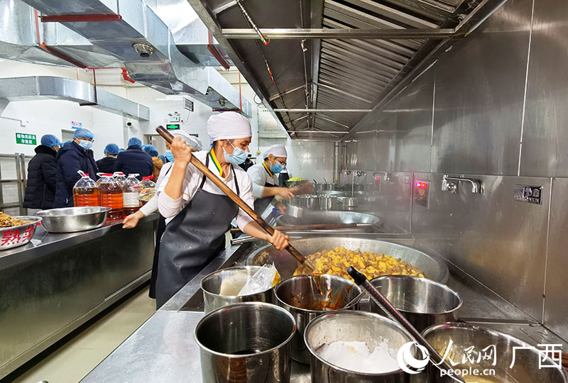 隆安县粤桂小学的食堂工作人员正在为学生准备午餐