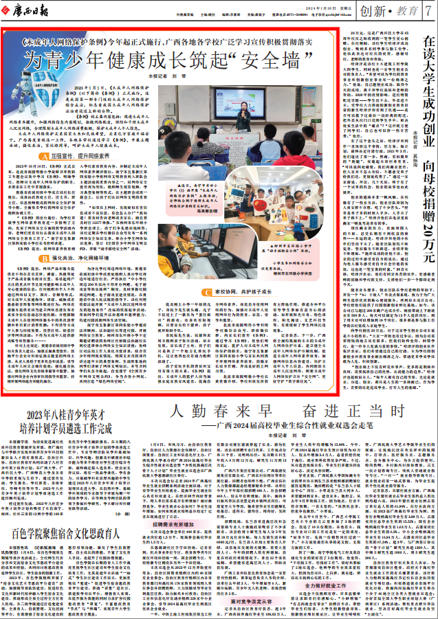未成年人网络保护关系国家未来和民族希望,关系亿万家庭幸福安宁。广西高度重视这一工作,各地各学校通过学习《条例》、开展主题活动、强化共治、家校协同等,呵护未成年人健康成长。