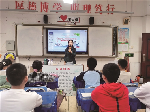 近日,南宁市秀田小学六(1)班开展“未成年人网络保护条例”主题活动,老师结合例子讲解未成年人网络保护条例有关知识。 陈高丽亚/摄