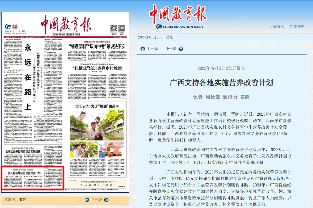 广西高度重视改善和提高农村义务教育学生健康水平,2023年,经自治区人民政府研究决定,广西启动实施农村义务教育学生营养改善计划全覆盖工作,并于2023年10月7日起实现50个扩面县营养餐开餐。