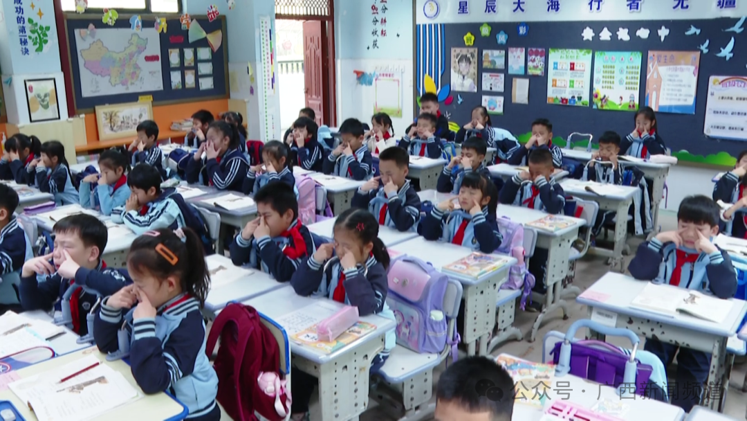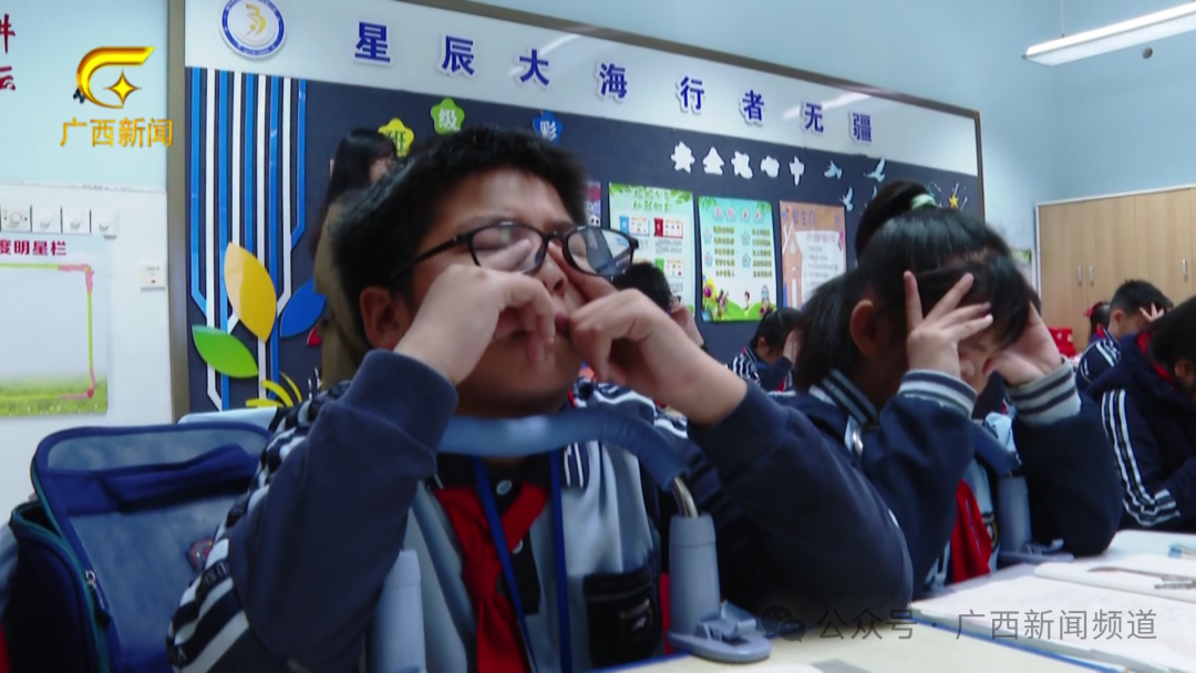 南宁市五象新区第一实验小学自2016年建校起,就把近视防控工作作为学生日常行为规范的主要抓手之一,80个班级里,每班都有一名近视防控宣讲员,孩子们对近视形成的原理、如何预防近视、什么样的光线适合用眼卫生等知识了如指掌。
