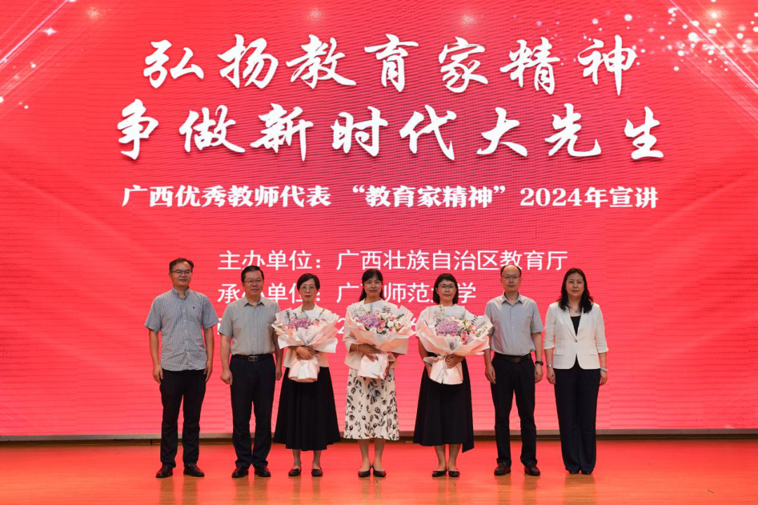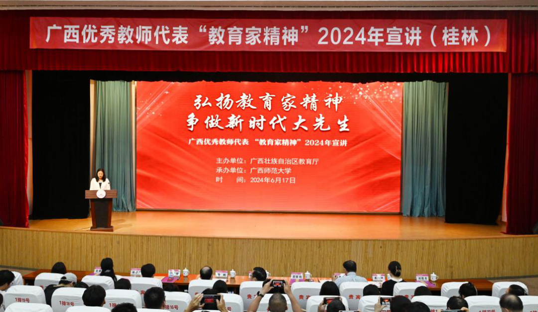 为深入学习贯彻习近平总书记关于教育的重要论述,大力弘扬教育家精神,全面提升师范生整体素质和推进高质量教师队伍建设,6月17日,由自治区教育厅主办的广西优秀教师代表“教育家精神”2024年宣讲活动在广西师范大学启动,并举办了首场报告会。广西师范大学、桂林师范高等专科学校、桂林学院教师和师范生代表,桂林市中小学(含中等职业学校)、幼儿园校长和教师代表共400余人参与此次活动。