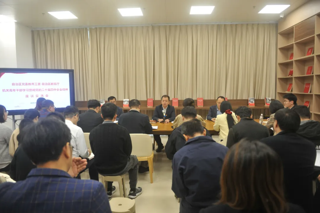 近日,自治区教育厅召开厅机关青年干部学习贯彻党的二十届四中全会精神座谈交流会,学习贯彻习近平总书记在党的二十届四中全会上的重要讲话和全会精神。自治区党委教育工委副书记,自治区教育厅党组书记、厅长闫炳辰出席会议并作专题宣讲,与青年干部面对面交流研讨。