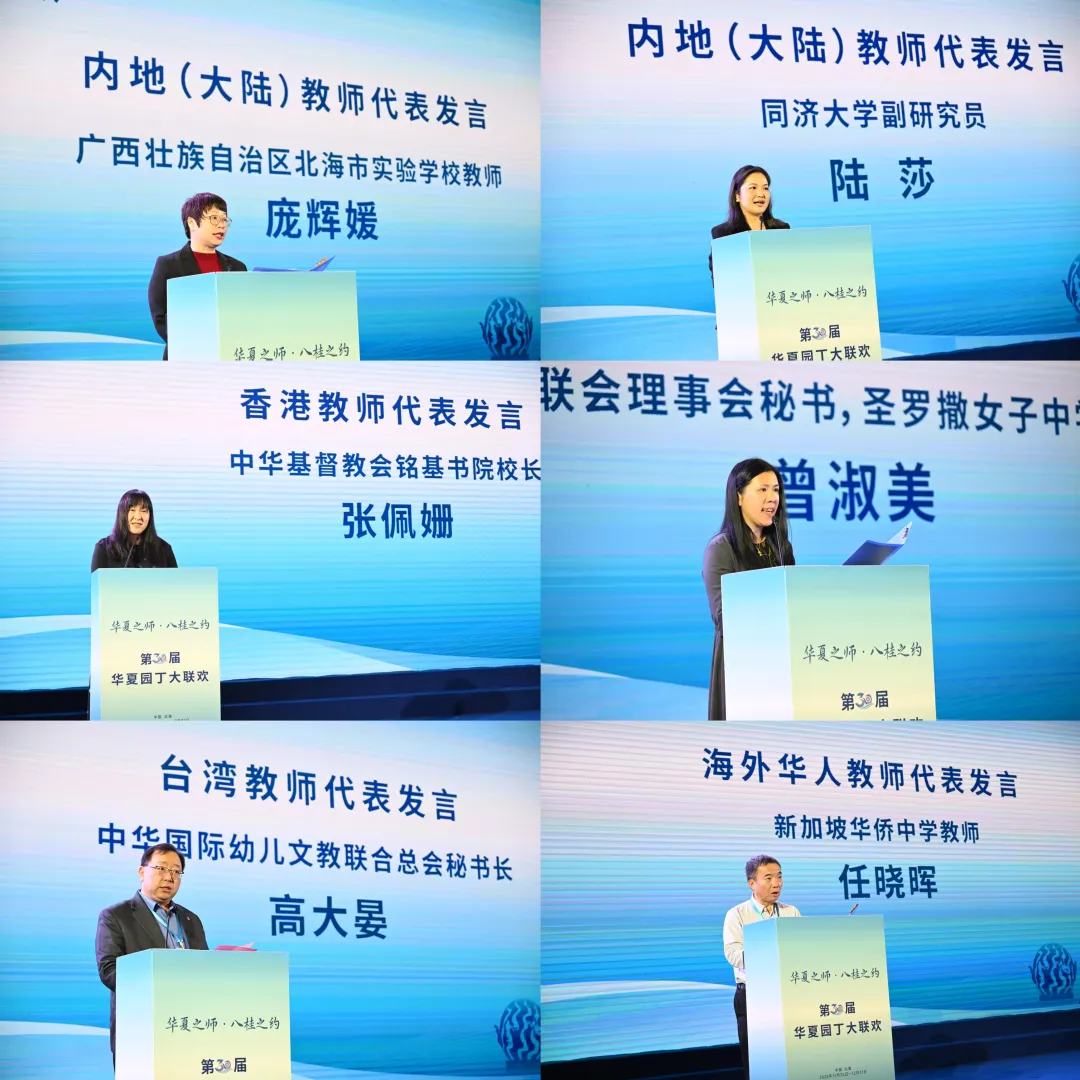 闭幕式上,内地(大陆)教师代表广西壮族自治区北海市实验学校教师庞辉媛和同济大学副研究员陆莎,香港教师代表中华基督教会铭基书院校长张佩姗,澳门教师代表天主教学校联会理事会秘书、圣罗撒女子中学中文部主任曾淑美,台湾教师代表中华国际幼儿文教联合总会秘书长高大晏,海外华人教师代表新加坡华侨中学教师任晓晖作交流发言。