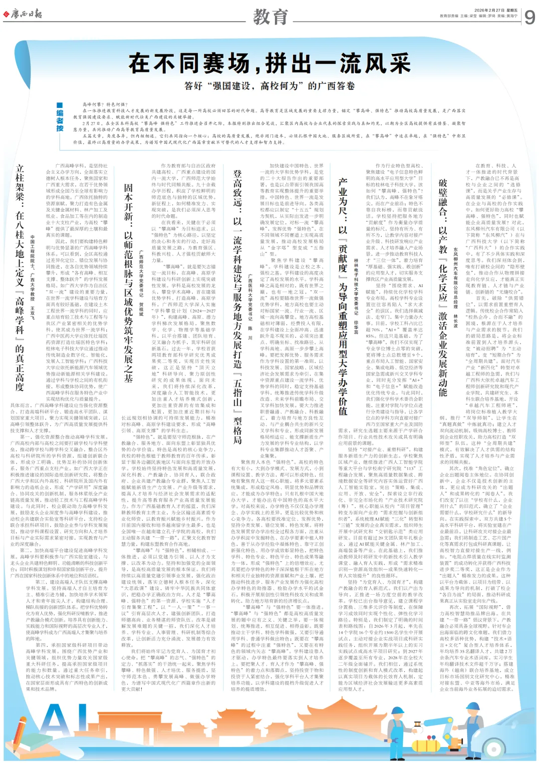 2月27日,在全区本科高校“攀高峰 强特色”工作推进会召开之际,本报特别推出组合笔谈,汇聚区内高校与企业代表的探索实践与真知灼见,以期为全区高校提供有益借鉴、凝聚智慧力量,共同推动广西高等教育高质量发展。