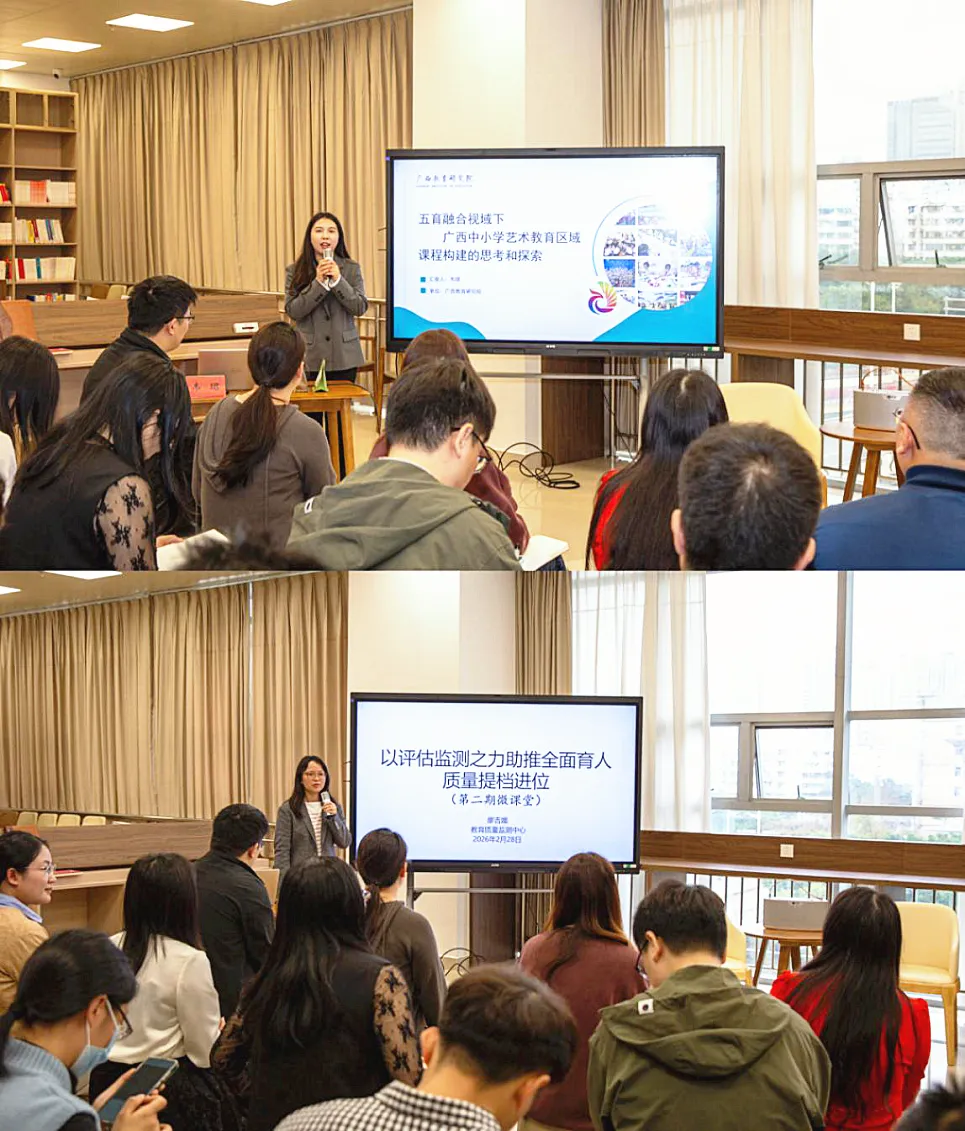 近日,自治区教育厅举办年轻干部“聚智强教 同题共答”微课堂第二期活动。本期活动以“构建全域协同、五育融合区域育人新生态”为主题,采用“主题分享—课堂沙龙—总结点评”相结合的形式开展。主题分享围绕广西中小学艺术教育区域课程构建的思考与探索、如何通过加强品牌意识与价值沉淀打造具有区域特色的美育金课、如何以评估之力助推全面育人质量提档进位等为题开展深入探讨。课堂沙龙围绕教育督导评估、教研支撑、党建引领、体卫艺管理等不同视角开展互动交流,就跨部门协同机制、区域教研共同体建设、评价标准动态调整等议题形成初步共识,体现年轻干部立足岗位、直面问题的思考深度与实践自觉。