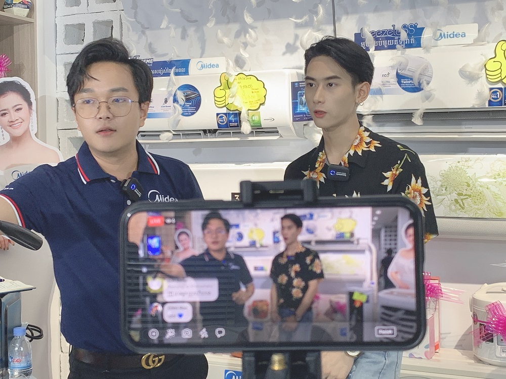 2019年8月,广西外国语学院柬埔寨语专业学生(右)在柬埔寨留学期间做直播带“国货”