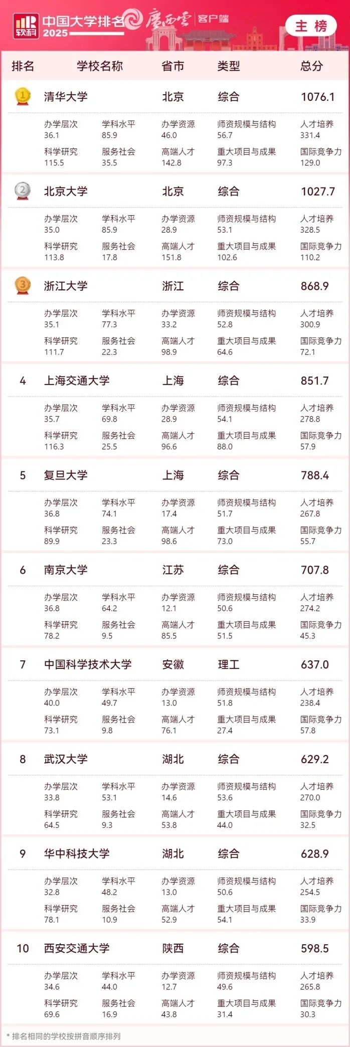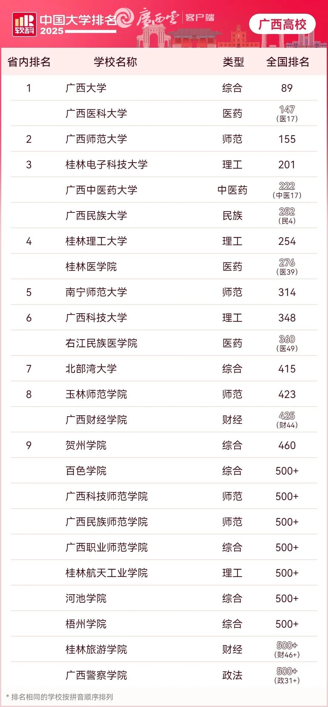 4月15日,高等教育专业评价机构软科发布“2025软科中国大学排名”。主榜(即综合性大学排名)中,广西共有9所高校进入500强,其中区内“双一流”高校广西大学排名全国第89名;从总榜(综合性大学+单科性大学排名)来看,广西共有30所高校上榜,其中公办高校24所,民办高校6所。