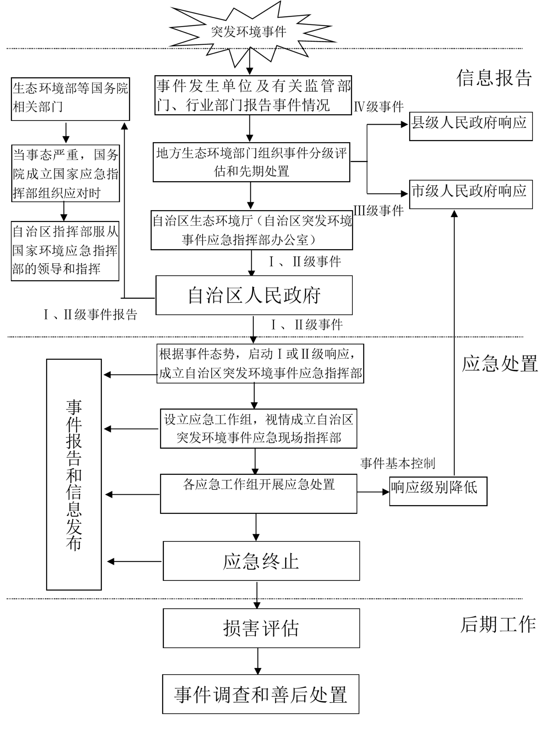 4.2.3 发生1.3.2和1.3.3规定的事件响应。发生超出事发地设区市人民政府应急处置能力且自治区人民政府决定启动应急预案的突发环境事件时,或者发生跨市级且自治区人民政府决定启动应急预案的突发环境事件时,按以下步骤进行响应: