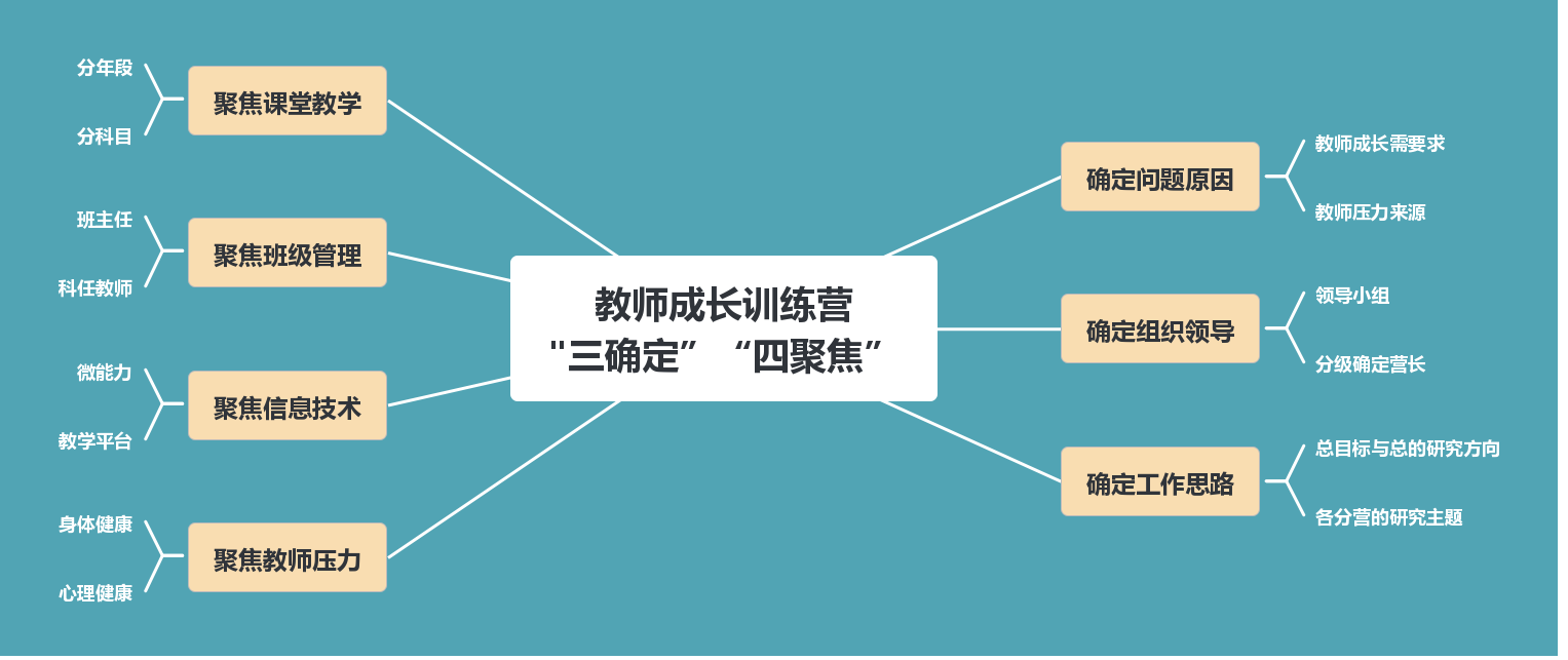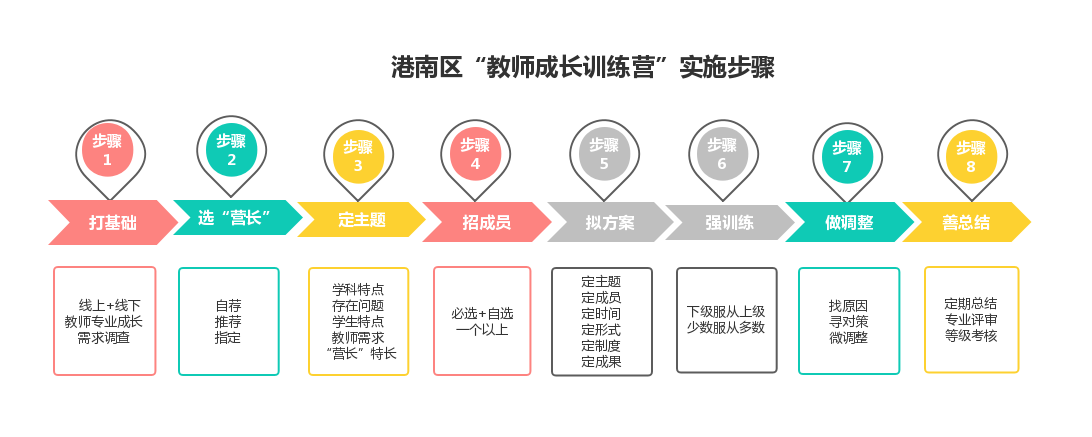【怎么做】“教师成长训练营”的实施主要分“八步走”:首先是做调查,通过“线上+线下”相结合的方式对教师成长需求做调查,得出调查报告。二是选“营长”,主要通过自愿报名、学校指定、教师投票推荐三种方式产生。三是定主题,各训练营围绕教育教学中最急需解决的难题,确定本训练营的研究主题。四是招成员,按照必选+自选的原则进行各训练营成员的确定。每个教师最少参加一个训练营的训练。五是拟方案,各“营长”带领本营成员共同确定本学期或学年的具体研究内容、时间安排、人员分工、预期目标等。六是强训练,每学期开学后,各训练营按制定的实施方案有序开展训练活动。七是做调整,在训练营活动开展过程中,遇到问题则做出适当的调整。八是善总结,学校每个学期举行一次“教师成长训练营成果汇报会”,对各训练营的成果进行评审。