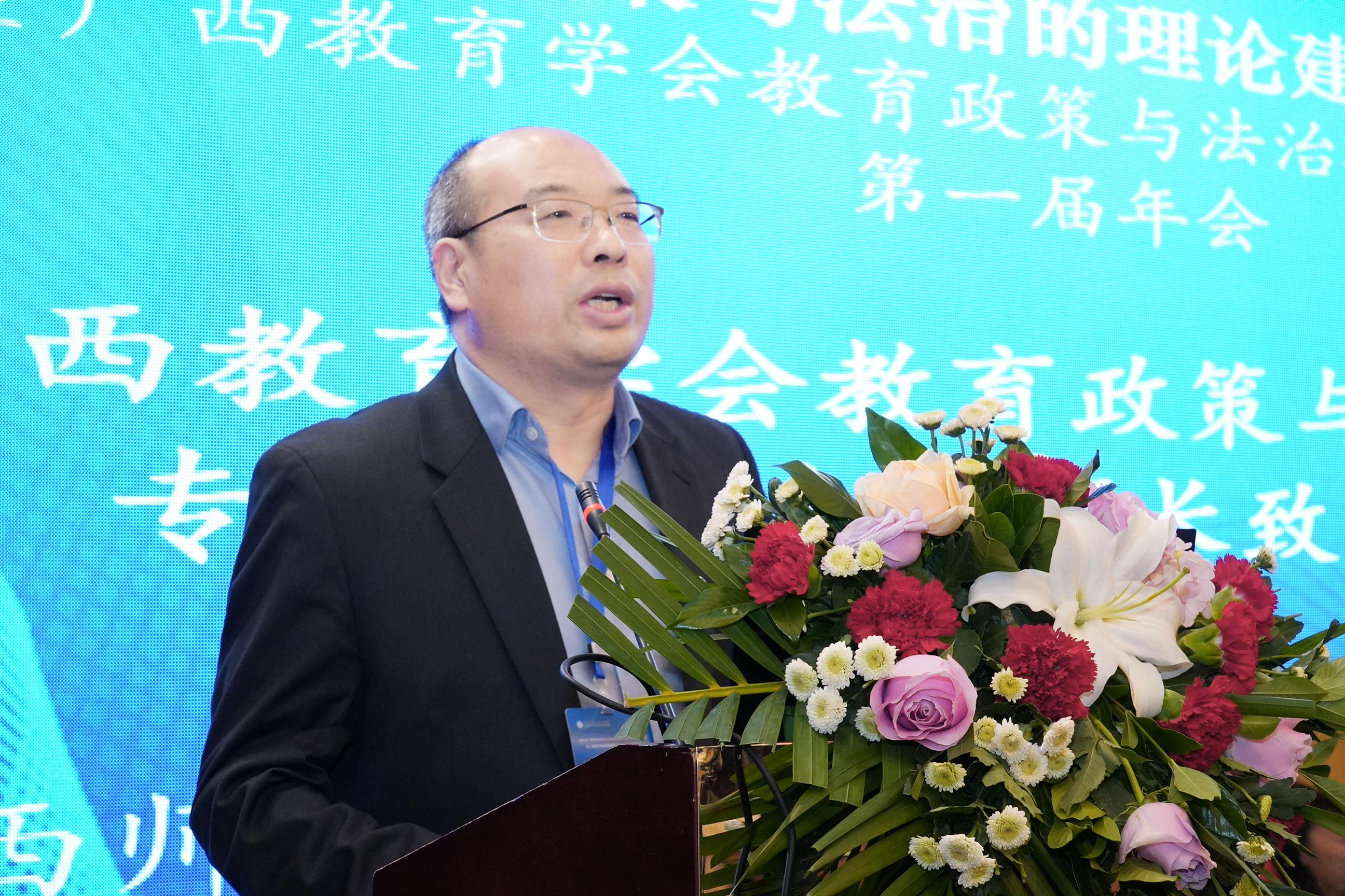 广西教育学会教育政策与法治研究专业委员会理事长、广西师范大学研究生院副院长马焕灵教授致辞。他指出,自广西教育政策与法治研究专委会成立以来,重点围绕三大职能开展工作:一是积极推进教育法学学科的建设;二是充分发挥智库作用;三是积极承担社会服务工作。他希望通过此次会议搭建专家学者和一线教师的交流平台,能促进与会代表积极沟通,充分交流,为推动广西教育治理体系与治理能力现代化建设贡献力量。