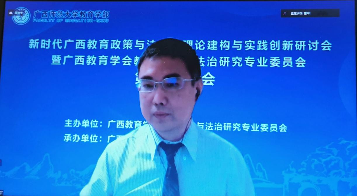广西教育厅法规处李辉善处长致辞。他谈到,全面指导全区教育系统法治建设和依法行政、依法治教和依法治校,是自治区教育厅政策法规处的一项重要职能,“十四五”期间将重点围绕健全以法律为核心的教育制度体系、推进教育部门依法行政、提升学校治理现代化水平、健全师生权益保障和救济机制等四个方面推进依法治教工作。他希望通过本次研讨会促进专家学者与一线教育工作者之间的交流,带来新的启发,为推动广西教育治理体系与治理能力现代化提出更多真知灼见。