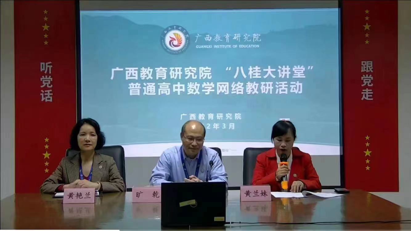 2022年3月30-31日,广西教育研究院组织开展的“八桂大讲堂”高中数学、历史网络教研活动顺利召开。广西教育研究院院长旷乾、副院长黄艳兰、教研院教研中心理科一室主任黄兰妹、武汉市教育科学研究院高中数学教研员孔峰、南宁市第二中学党委书记徐华、柳州铁一中副校长莫邦哲、柳州市兴柳学校党支部书记周健等专家出席了活动。广西教育研究院高中数学、历史学科中心组成员以及全区2万多名教师通过广西网络教研平台在线收看了活动直播。