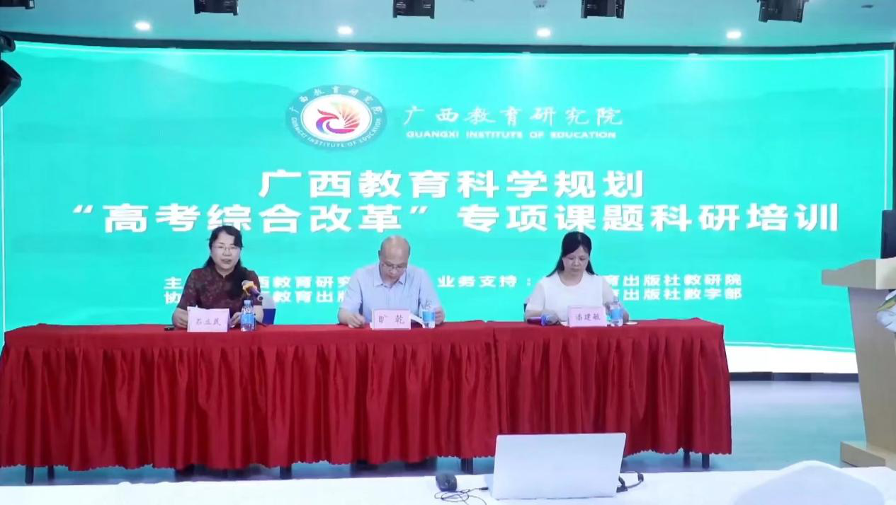 为进一步推进广西教育科学规划2021年度“高考综合改革”专项课题研究,提升课题团队的研究能力和科研水平,2022年7月26—27日,由广西教育研究院、广西教育科学规划领导小组办公室主办、广西教育出版社承办的广西教育科学规划“高考综合改革”专项课题科研培训(第一期)在南宁市顺利举行,122项专项课题负责人及成员参加会议。广西教育研究院院长旷乾同志出席会议并讲话,广西教育出版社社长石立民同志致辞。