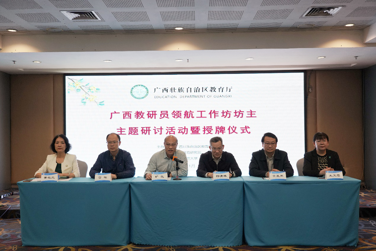 2022年11月24日,第一批广西教研员领航工作坊坊主主题研讨活动暨授牌仪式在南宁举办。自治区教育厅人事处处长杨清林、教师工作处处长曾晖、基础教育处副处长黄玉鑫等相关处室领导以及南宁师范大学教师教育学院副院长王文蓉应邀参加活动,广西教育研究院院长旷乾出席授牌仪式并讲话,活动由广西教育研究院副院长黄艳兰主持。