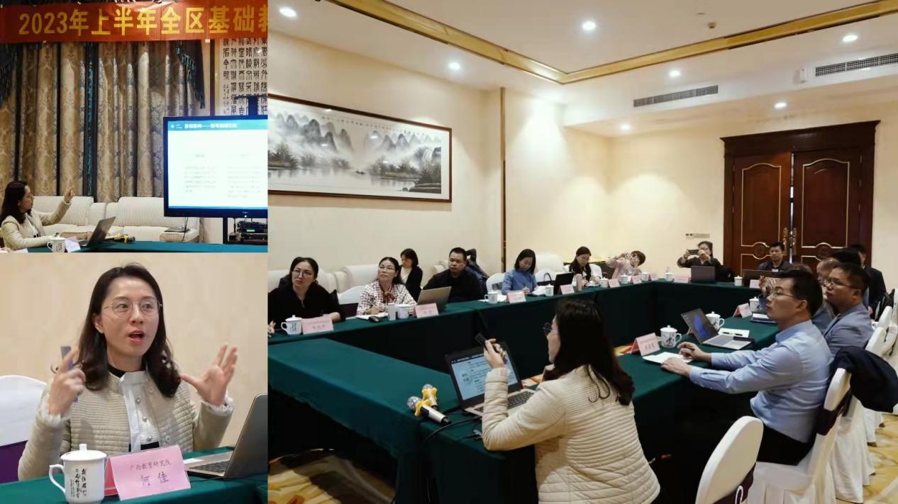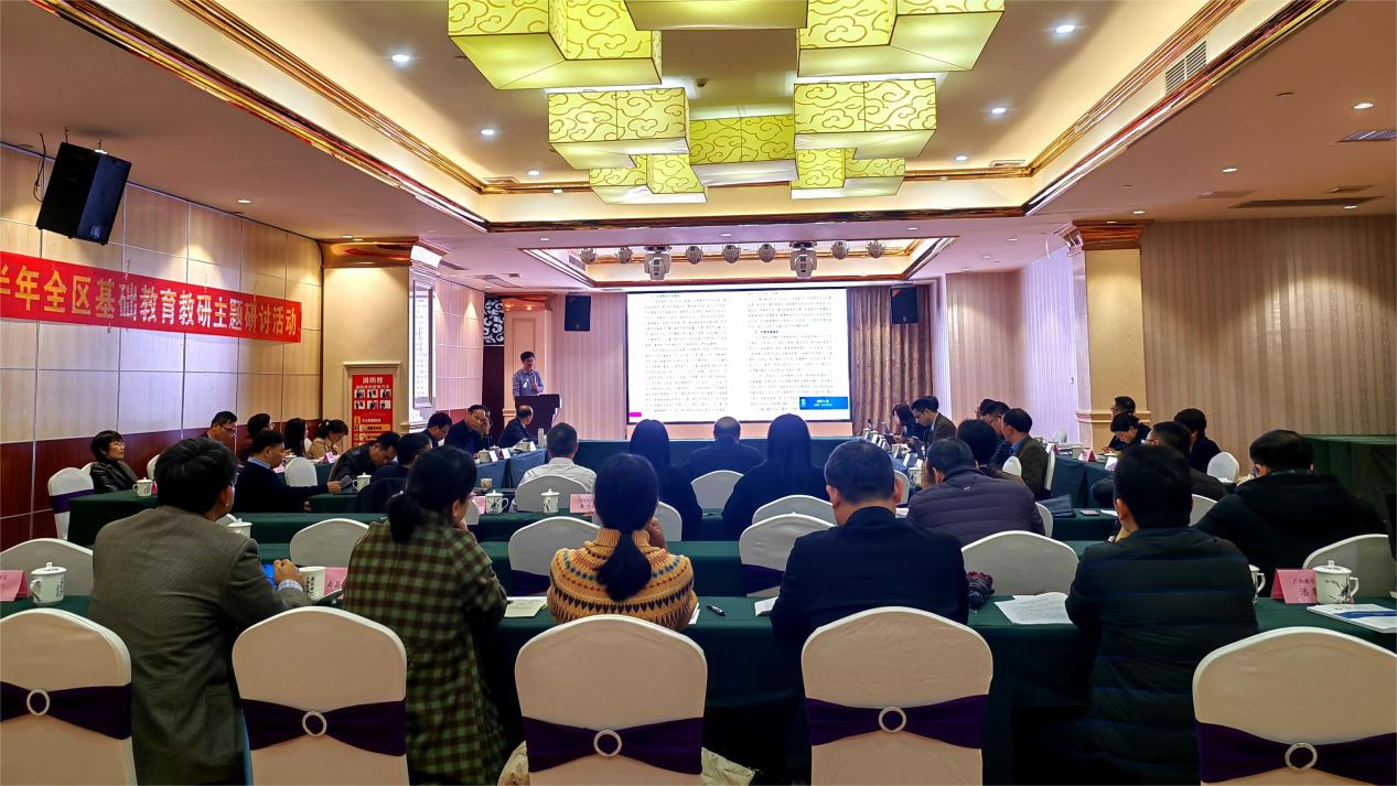 广西教育研究院院长旷乾从党建引领教研、资政研究、教研指导、课题实施、教育学会群团服务五个方面总结了2022年我区基础教育教研工作取得的成效,明确了2023年教研工作重点要继续服务好乡村振兴和边境教育质量提升,加快建设自治区-市-县-校四级教研联动机制,实施教研员能力提升工程,开展全区教研员全员轮训,推进教研员领航工作坊的建设,促进教研员专业能力建设提升,依托课题强化项目育人等方式切实提高教研工作科学化水平,促进基础教育高质量发展。