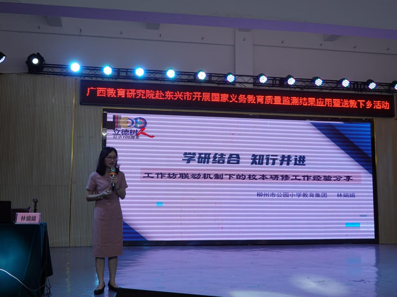 柳州市公园路小学林娟娟副校长以《学研结合 知行并进》为题分享工作坊联动机制下校本研修的工作经验,介绍了基于监测结果应用背景的“学-研-评”一体化校本研修机制建设和常态化校本研修推进方式。