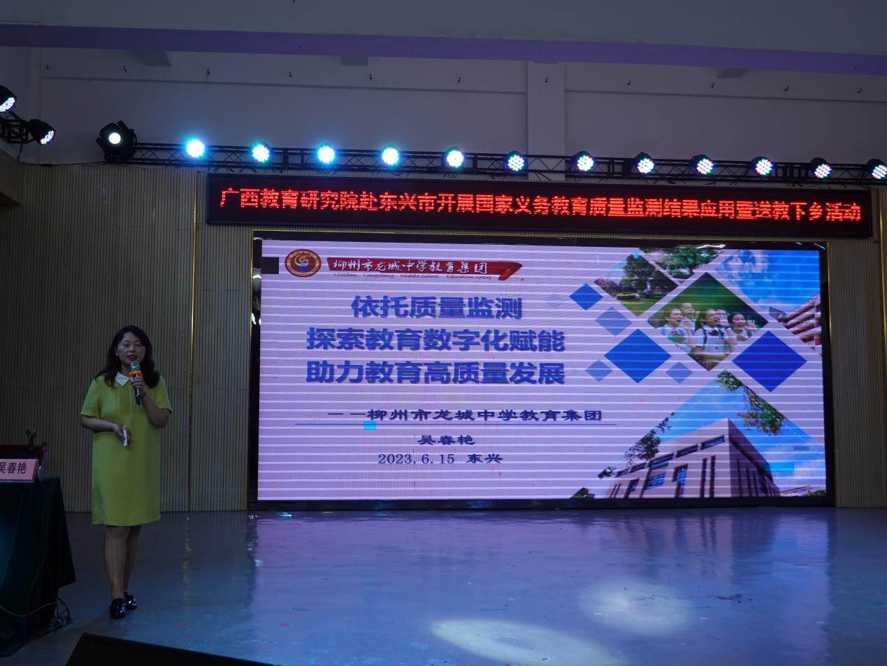 柳州市龙城中学吴春艳副校长以《依托质量监测 探索教育数字化赋能 助力教育高质量发展》为题,从“课题引领数据教学研究”“聚焦施策数据驱动精准教研”两方面分享了质量监测结果应用经验。