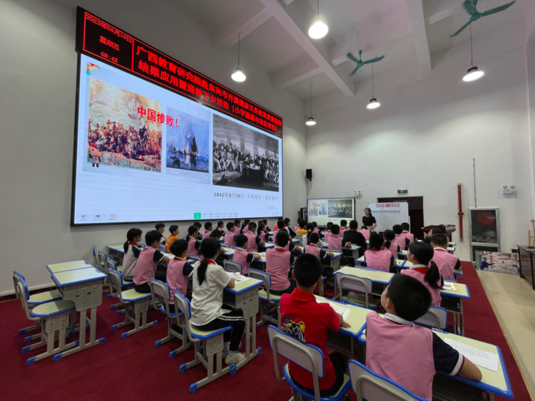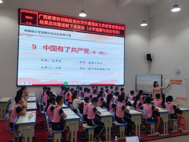 南宁市凤翔路小学科研室主任、南宁市学科带头人、黄新清名师工作室成员王俊老师在东兴市第七小学送教《中国有了共产党》(五年级下册第九课)。