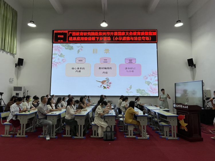 南宁市教育科学研究所教研员、正高级教师、广西特级教师黄新清老师为东兴市小学道德与法治学科代表教师作专题讲座《基于发展学生核心素养的小学道德与法治教学实践》。她从核心素养内涵、教材内容编排、课例研讨与分析三个方面阐释依标扣本创设情境设计教学的思路方法。