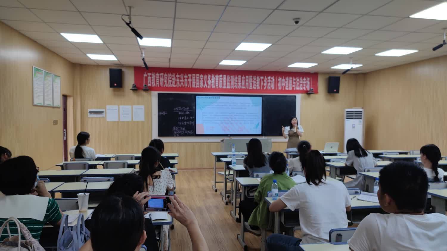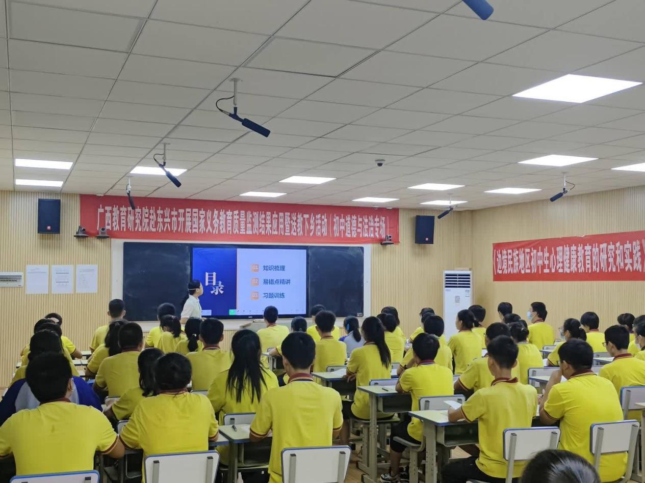 广西教研员吴玉龙领航工作坊成员、南宁市江南区教育局教研室江岸老师以送教课《法律保障生活》引导学生辨析问题、解决问题,并为当地教师作专题讲座《核心素养导向下初中道德与法治教学评的一致性》。江岸老师着重介绍了基于核心素养导向的教师教导、学生学习、教学评一致的重要性和做法,强调初中道德与法治的课堂教学要坚持以素养为导向、以能力为重点、以知识为基础,注重学习过程和学生行为导向的评价,以评促教、以评促学,落实立德树人的根本任务。