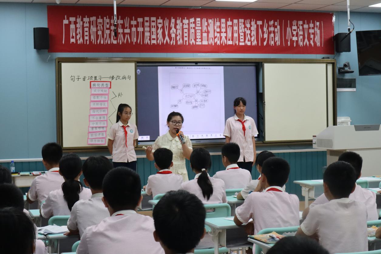 东兴市第三小学教务处副主任毛宣茹老师展示了复习研讨课例《修改病句》。她在学生自主梳理、探究、总结的学习过程渗透学法指导,引导学生在多元练习中强化修改病句的能力。