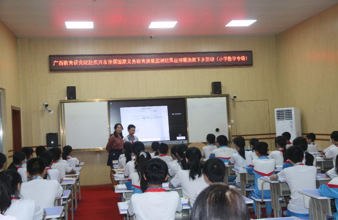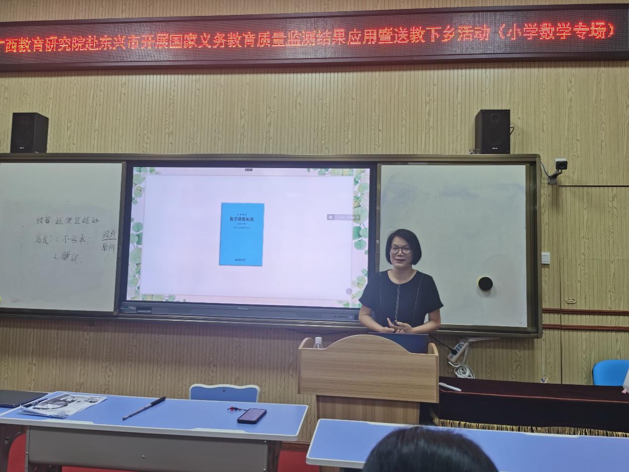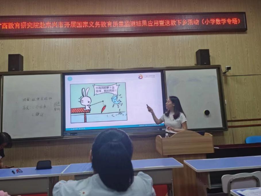 广西教研院小学数学教研员何佳作主题讲座《基于新课标理念的小学数学课堂教学思考》。她结合东兴市小学数学质量监测的数据,分析了东兴市小学数学教学存在的问题,并从“课堂教学”和“作业设计”两个维度提出了改进建议。