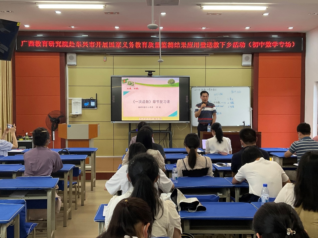 柳州市教育科学研究所副所长、正高级教师张享发结合送教课例作主题讲座《“章节复习课”的教学策略》,围绕大家最为疑惑的四大问题——什么是章节复习课,如何开展章节复习课,如何设计章节复习课,章节复习课的不足之处,阐述了常规新课教学与章节复习课彼此为“画龙”“点睛”关系的理念。