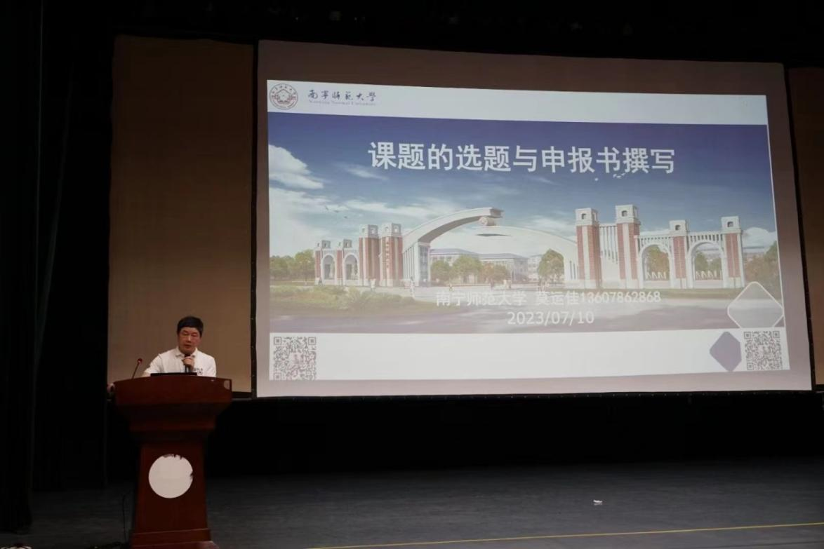 培训当天上午,南宁师范大学莫运佳研究员作了题为《课题的选题与申报书撰写》的专题讲座。讲座围绕“课题选题技巧”与“课题申报书撰写要领”两大内容板块进行,结合具体案例,对选题方法进行了详细而系统地介绍,将申报书各部分拆解后展开细致地论证分析与讲解示范,为教师们如何在凝练教育实践经验的基础上提高申报质量提供了思路和指导,具体的案例也为课题申报者提供了可借鉴的范本。