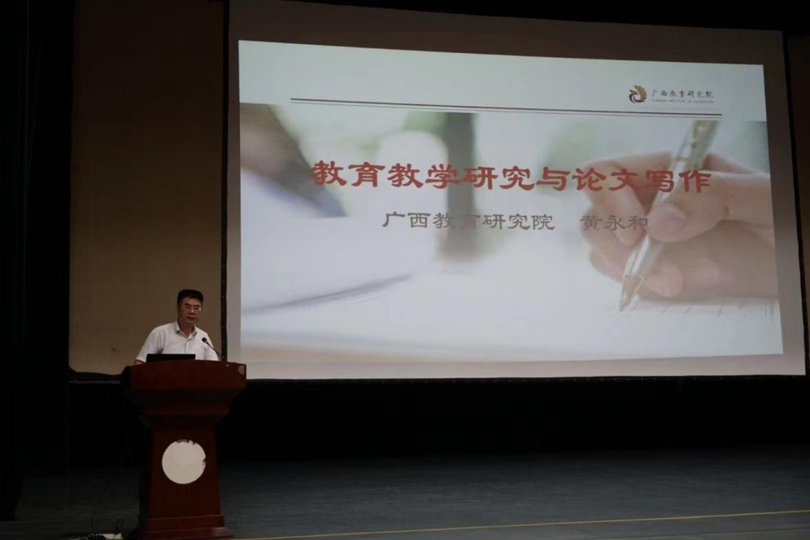 在下午的专家讲座中,广西教育研究院黄永和副书记作了题为《教育教学研究与论文写作》的专题讲座,黄副书记指出优秀的教育教学论文具有目标性强、学术性强、可读性强、操作性强、指导性强等特点,要做好教育教学研究与写作就要做好九个步骤,建议各位教育研究者从“模仿”开始,实事求是、脚踏实地、持之以恒地撰写,就一定会有所收获。