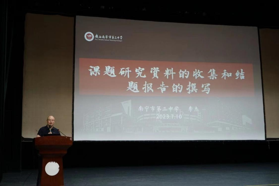 南宁市三美学校李杰书记作了题为《课题研究资料的收集和结题报告的撰写》的专题讲座,强调在研究资料的收集、整理与分析上,要注重计划性、时效性、真实性和典型性,要对研究资料进行审查和分类;在课题研究报告撰写上,要做到“齐、明、实、美”,结题材料文本要素和结构齐全,文字内容逻辑清晰、语言流畅,研究数据、结论实事求是,文本格式整齐美观;在课题结题指导上,课题研究者需站在评审专家的角度,从科学性、创造性、学术性、针对性、可读性方面对自身结题材料进行审查,同时避免结题报告撰写中的常见错误。