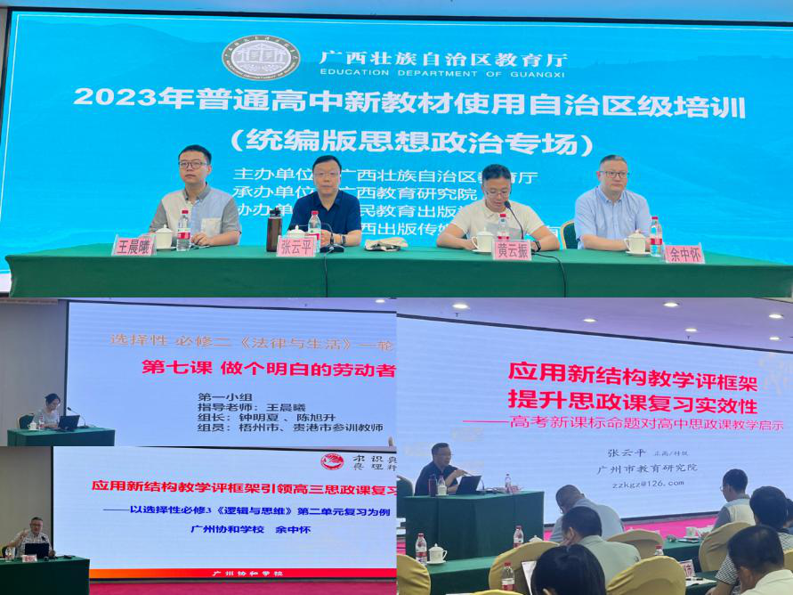 在统编版思想政治学科教材培训会场,广州市教育研究院教研员张云平教授详细介绍了新结构“教-学-评”框架在教学中的运用;广州大学附中王晨曦以及广东省协和中学的余中怀老师分享了高中新教材教学的优秀课例;区内高中思政教研员、骨干教师分组研磨共呈现了六节基于新结构“教-学-评”框架的复习课课例。思政学科此次培训重点任务是帮助教师应用新结构“教-学-评”框架提升高三思政复习实效性、理清了高三复习思路,指明了新教材新高考的备考方向。