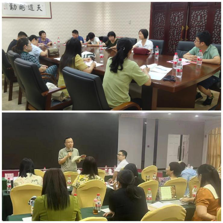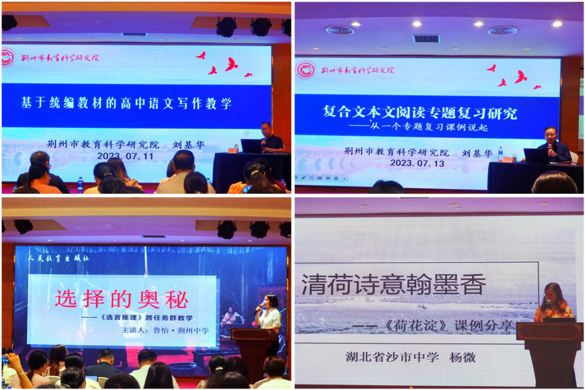 在统编版高中语文学科教材培训会场,湖北省荆州市高中语文教研员刘基华基于统编高中语文教材作了写作教学、复合文本阅读复习方面的专题讲座;湖北省荆州中学语文教师鲁怡、湖北省沙市中学语文教师杨微分别展示了课例《选择的奥秘—<选言推理>跨任务群教学》《荷花淀》,并作高三复习备考专题讲座,深入探讨了备考的方向和策略。区内高中语文教研员、骨干教师就不同的学习任务群分组研磨,以3个课例展示了如何在新教材使用中落实“语言积累、梳理与探究”“文学阅读与写作”“思辨性阅读与表达”任务群教学,以系列课例展示了“语言特色”专题复习。