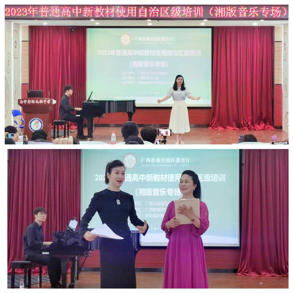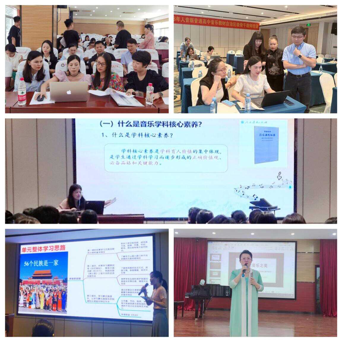 在音乐学科教材的培训会场,人民音乐出版社主编杜永寿博士,湖南师范大学音乐学院郭红丽副教授以及来自深圳、湖南、广西的教研员、一线教师组成的培训专家团队针对人音版和湘教版教材分别开展专题讲座、技能训练、团队展示和专家点评等多种形式的培训活动。本次培训以任务驱动方式聚焦鉴赏模块和歌唱模块教学,在市级团队为小组的参与式培训中探索大单元学历案的设计,并通过分享点评引领带动区域普通高中音乐教师共同研究、共同发展。