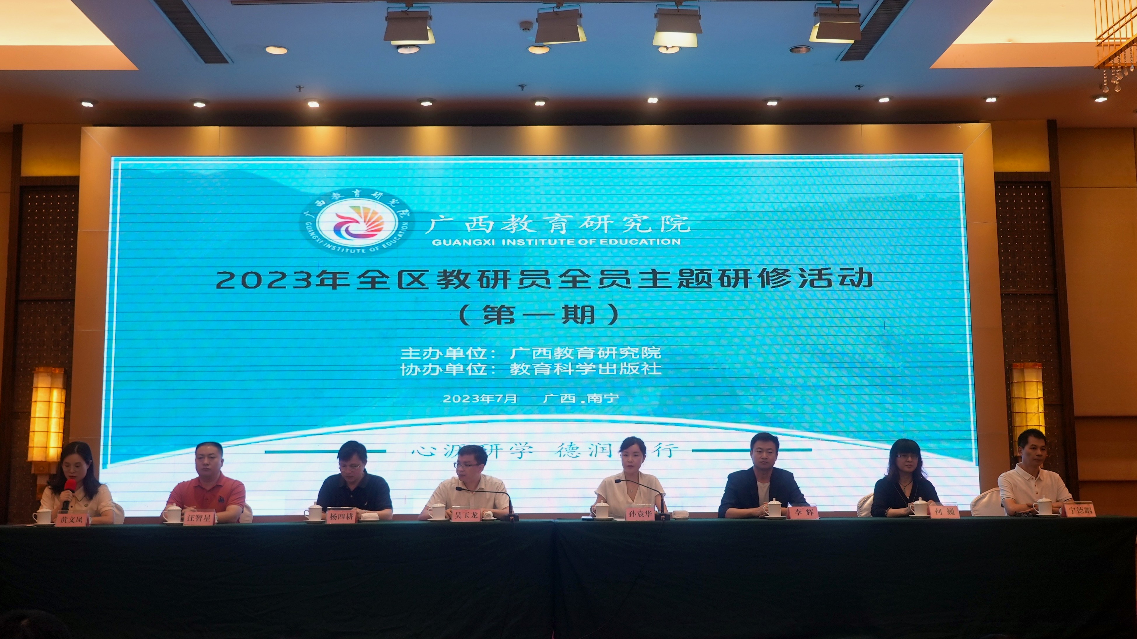 2023年7月25—26日,第一期自治区教研员全员主题研修活动在南宁顺利开展。活动的主题是校本课程建设,课程内容涉及校本课程的开发、设计、实施、评价等,聘请了北京、上海、湖南等区外在校本课程研究与实践领域有建树的专家到现场指导,研修方式有专题讲座、案例分析、研讨交流等,自治区、设区市、县(市、区)的初中道德与法治、语文、英语、历史4个学科的专职教研员等400多人参加了第一期的研修活动。广西教育研究院吴玉龙副院长、教育科学出版社孙袁华副总编辑以及南宁、柳州、玉林等部分设区市教研部门负责人参加了本次活动。
