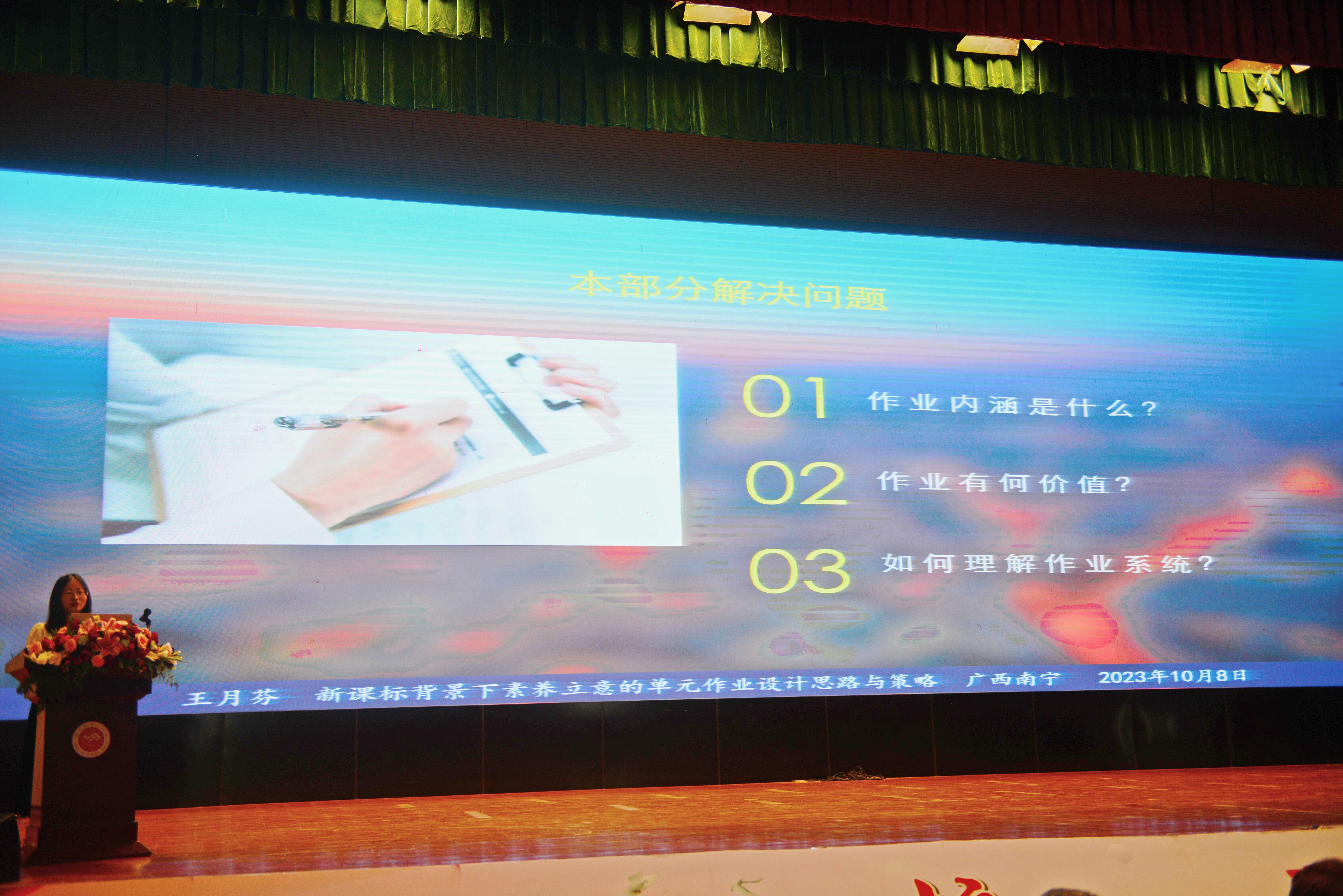 下午,由南宁市教科所黄新清老师作优秀课题研究成果展示,熊德雅副所长作点评指导。随后,12个荣获作业设计一等等次的团队分别进行成果展示,南宁市南湖小学张永红校长作《单元视域下如何精准确定作业目标和作业内容》讲座,广西师范大学唐剑兰教授作《如何设计单元进阶式作业》讲座。