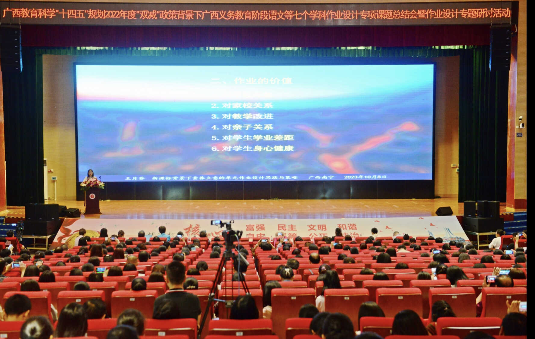 为全面落实“双减”政策,充分发挥作业育人功能以及“作业设计”专项课题优秀成果的辐射、引领作用,促进“教-学-评”的有效实施,提高学校教育教学质量,10月8日,广西教育科学“十四五”规划2022年度“双减”政策背景下广西义务教育阶段语文等七个学科作业设计专项课题总结会暨作业设计研讨活动在南宁市第三中学初中部青秀校区举行。自治区教育厅基础教育处负责人、广西教育研究院院长旷乾,广西教育出版社社长石立民出席活动并致辞。