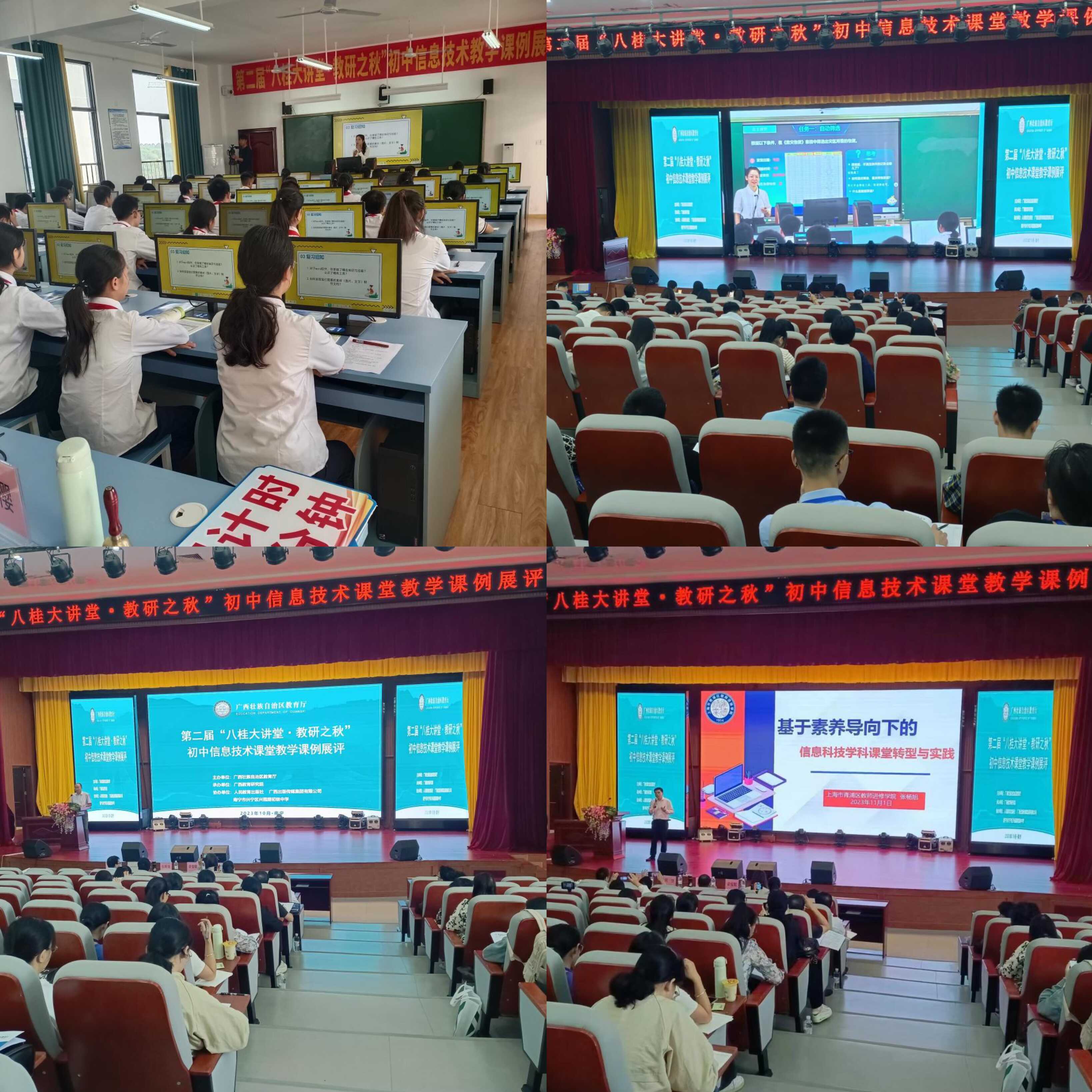 10月30日-11月1日,初中信息技术课堂教学案例展评活动在南宁市兴宁区兴园路初级中学开展,广西教研院信息技术教研员姚进宏主持此次活动,14位展评选手分别按照既定顺序,利用现代信息技术和多媒体教学手段,从课程定位、教法学法、教材学情、教学过程等方面对课程教学设计案例进行了展示。展评完毕后,张杨旭老师作《基于素养导向下的信息科技学科课堂转型与实践》的专题讲座。
